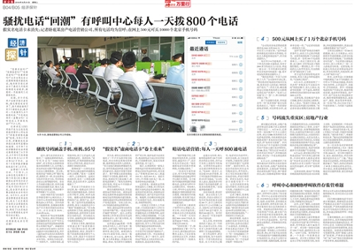 8月21日,新京报记者针对骚扰电话回潮进行了调查报道,通过暗访某房产电话营销中心,发现每位员工每天大约"盲打"800通电话,保守估计该公司每天至少能呼出8万通电话。