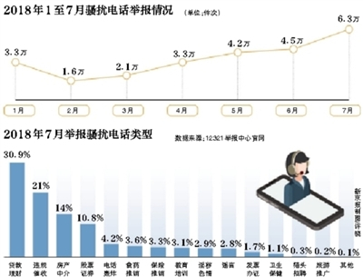 今年7月,12321举报中心收到的举报涉嫌骚扰电话6.3万件次中,贷款理财类、违规催收类和房产中介类的举报信息居前三位,占比分别为30.9%、21.0%和14.0%。