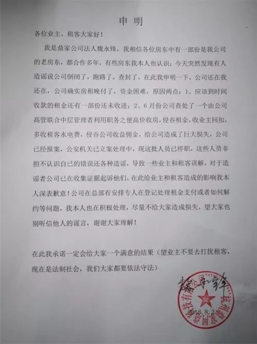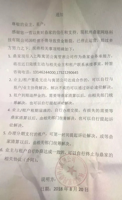 实际上,此前鼎家就因拖欠租金被传资金断裂,8月2日该公司法人魏永锋就此发布公告称,其中有误会,望大家不要听信谣言。8月15日,意识到事情不对劲的业主和租户就赶到鼎家办公处维权,他们发现办公处已经被搬空,还在职的员工表示,公司处于这样的状态已经好几天。再接着,就迎来了一纸破产通知。