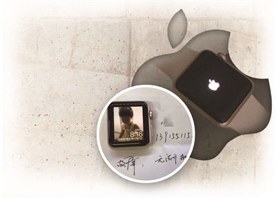 一边说着,黄女士一边向记者展示了一张她所拍摄的照片。在照片中,记者看到iWatch的屏幕呈现黑屏状态,中间是一个白苹果,闪着亮光。