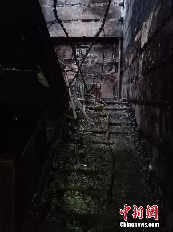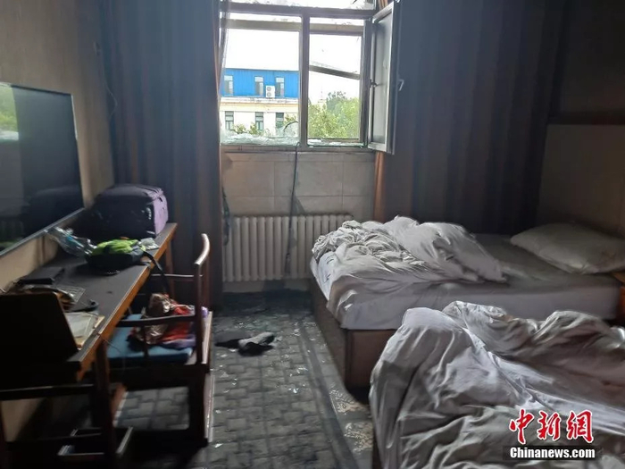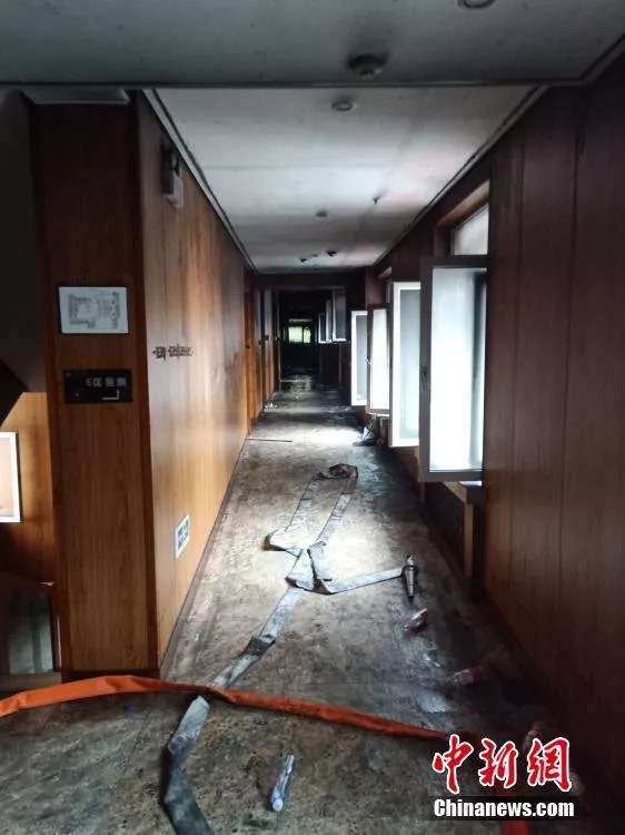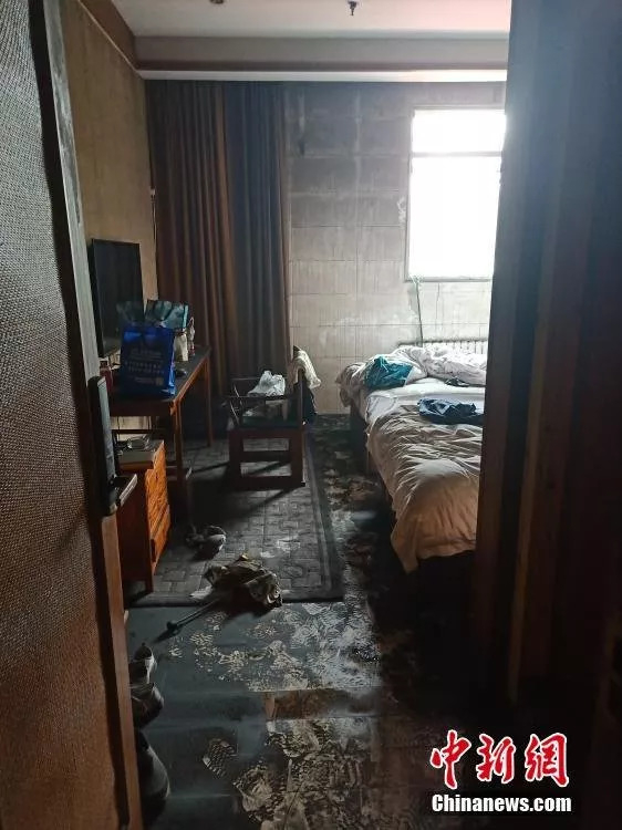 目前,火灾救援工作正在进行中,起火原因尚待调查。图为起火酒店客房一片狼藉。