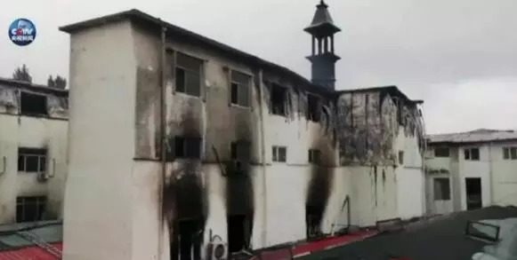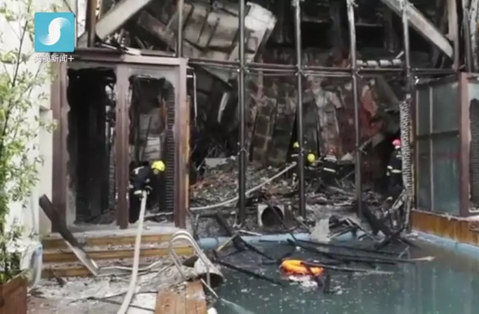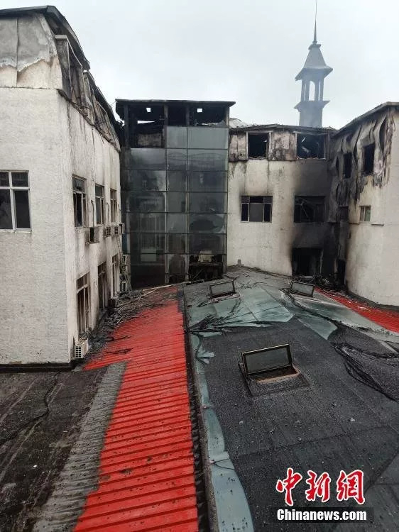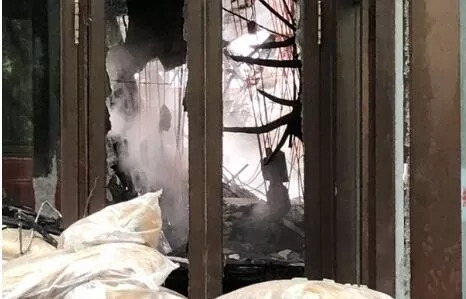 连接两个楼体的10米高大厅整个被烧塌,大厅玻璃墙体爆炸。