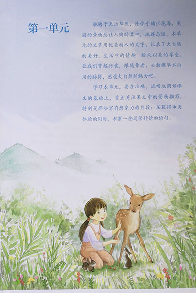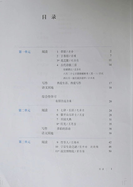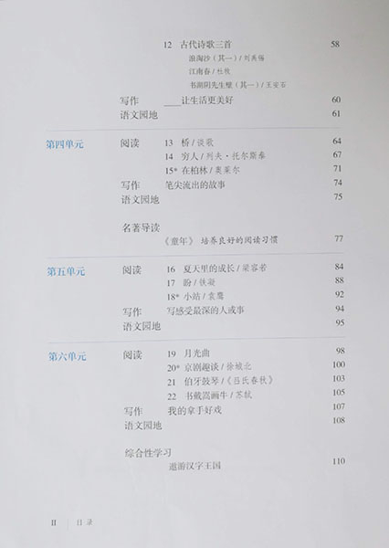 学生将在一学期中接触10首古诗,其中,第4课和第12课各有3首古诗,在”课外古诗词诵读“部分则另有《逢雪宿芙蓉山主人》(刘长卿)等4首古诗。教材第六单元则通过《京剧趣谈》《伯牙鼓琴》《书戴嵩画牛》三篇课文带领学生领略传统文化之美。