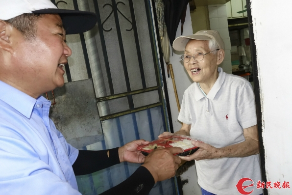 图说:助老送餐员李树明为家住江苏路的86岁竺阿婆送上助老餐。刘歆 摄