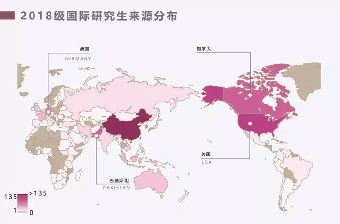 2018年共录取来自98个国家的国际研究生999人,其中来自美国、加拿大、巴基斯坦、德国、韩国的人数最多。