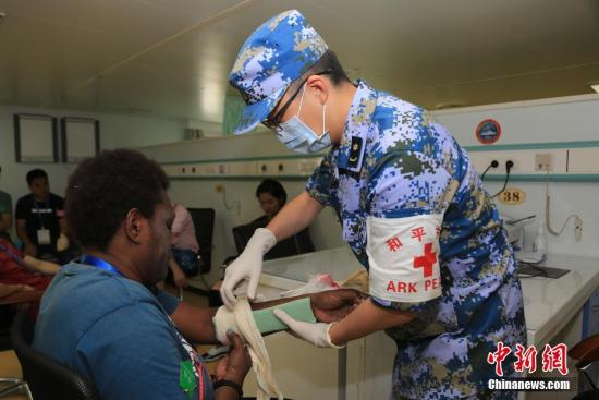 资料图:在和平方舟医院船上,和平方舟医生对骨折伤员进行固定包扎。中新社发 史奎吉 摄