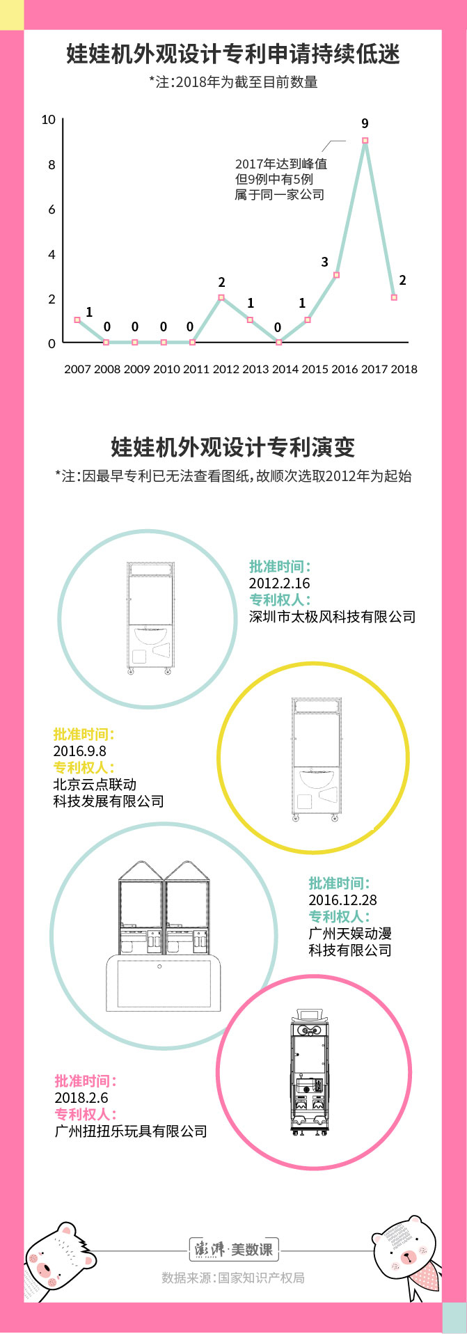 澎湃新闻(www.thepaper.cn)通过国家知识产权局网站查询到,目前,娃娃机的外观设计专利共19例。最早一例由自然人周志军于2007年4月申请。