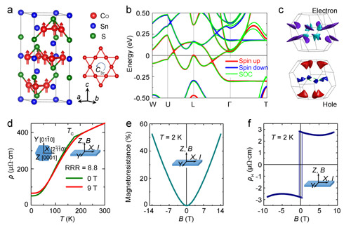 图1:Co3Sn2S2的晶体结构、半金属电子结构及电输运行为