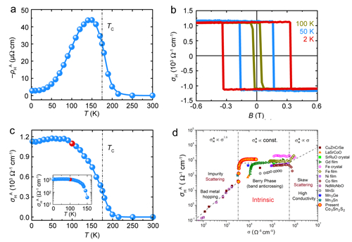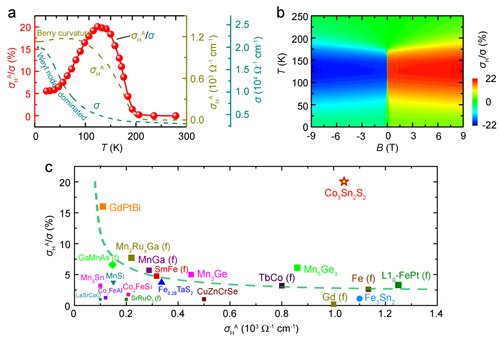 随后,刘恩克采用自助溶剂等方法生长了高质量单晶样品。在150 K的宽温区内观察到了大反常霍尔电导(~1130Ω-1cm-1)和巨反常霍尔角(~20%),均比常规磁性材料高出一个数量级。电输运测量表明,Co3Sn2S2具有非饱和的正磁电阻和低的载流子浓度,表现出补偿型半金属特征。同时,反常霍尔电导对温度和纵向电导均无依赖关系,使得该体系在反常霍尔效应的统一模型中居于内禀的“贝利相位”区,表明该体系中的反常霍尔效应来源于动量空间的贝利曲率。在较宽的温区内稳定存在的贝利曲率与低载流子浓度半金属特性使得Co3Sn2S2获得了巨大的反常霍尔角。