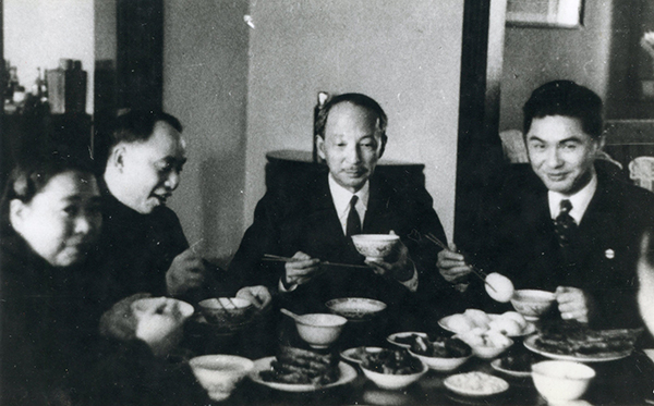 童润夫与荣毅仁等友人共进午餐,右一为荣毅仁,右二为童润夫。