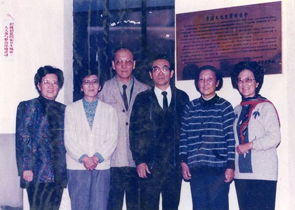 童润夫六子女在上海市纺织工程学会童润夫基金铜牌前留影(1996年),从左到右依次为:三女童晓礼、次女童雅礼、长子童本亮、次子童本一、长女童眉礼、幼女童心礼。