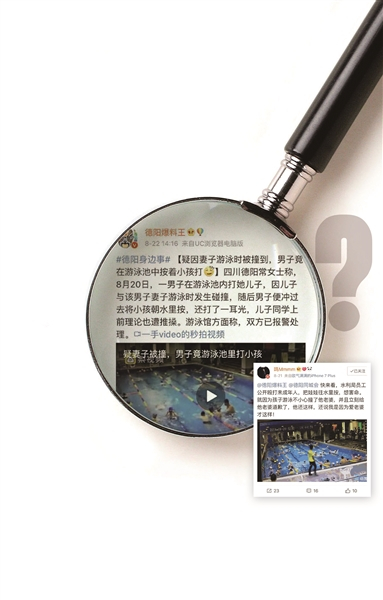 据调查,8月21日当天男孩家属除了到安医生的单位闹事,还把录下来的摩擦视频剪辑之后发布到网络上称“水利局工作人员殴打未成年娃娃”。8月22日微博“一手video”发布泳池视屏,并配文字“疑因妻子游泳时被撞到,男子竟在游泳池中按着小孩打”。而不少有影响力的网络媒体未向当事双方进行核实,就进行转发。其中德阳一家本地自媒体“德阳爆料王”的转发在当地造成的影响可能更大。不少网友在底下评论,指责安医生的丈夫对孩子动粗。