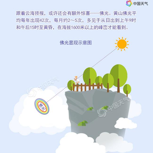跟着云海预报,或许还会有额外惊喜--佛光。黄山佛光平均每年出现42次,每月约2~5次,多见于从日出到上午9时和午后15时至黄昏,在海拔1600米以上的峰峦才能看到。