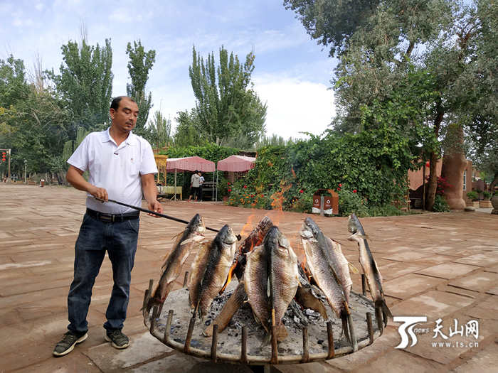 农家乐老板在做烤鱼。