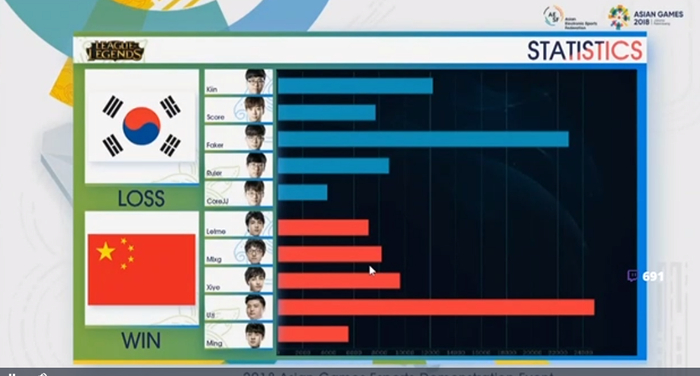 据英雄联盟官方微博账号8月29日报道,小花生奥拉夫gank,留住没闪现酒桶将其击杀,韦鲁斯拿到一血,@mlxgzzz gank下路,小花生跟进很快,最终打成2换2,@UziQAQ 双杀!韩国队不断找到机会抓单,中国队中路双杀韩国下路。@RNGLetme 单杀奥拉夫,中国队拿下大龙完成1换5,但没依靠大龙拿到优势,韩国反打。中国队再拿下一条大龙,逐步攻破三路拿下比赛。随后场上升国旗,奏国歌。