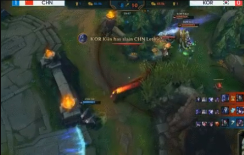 随后比赛来到第三局,求稳的韩国队决定使用他们国家最强大的41分推阵容去应对中国队,韩国队ban掉璐璐、青钢影、加里奥、杰斯和妖姬,选择韦鲁斯、洛、船长、奥拉夫和佐伊。中国队则ban掉剑魔、阿卡丽、瑞兹、巨魔和千珏,选择酒桶、霞、牛头、奥恩和卡萨丁,这样一套双核体系应对韩国队,Letme在上局发挥失常以后,拿出了招牌英雄“奥恩”,而UZI则掏出了霞作为全队的核心。