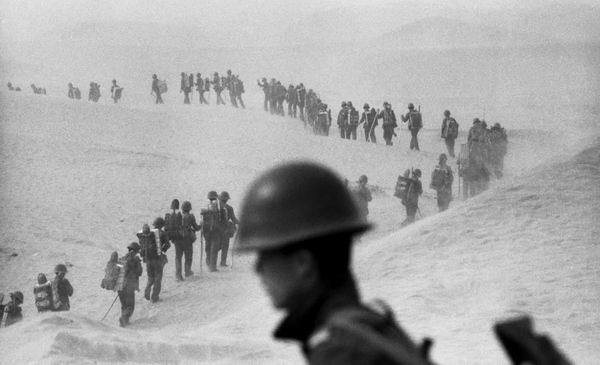1990年11月29日,甘肃兰州军区某部全副武装的官兵徒步进入塔克拉玛干大沙漠进行生存训练。(王建民/摄)