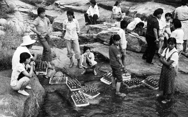 1985年夏,北京延庆龙庆峡,当地农民把汽水泡在山泉里冰镇,以期卖个好价钱。