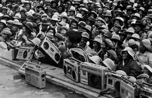 1983年,西藏那曲赛马会上,牧民把收录机摆在舞台边沿,录取台上民间艺人的格萨尔说唱节目。(扎西次登/摄)