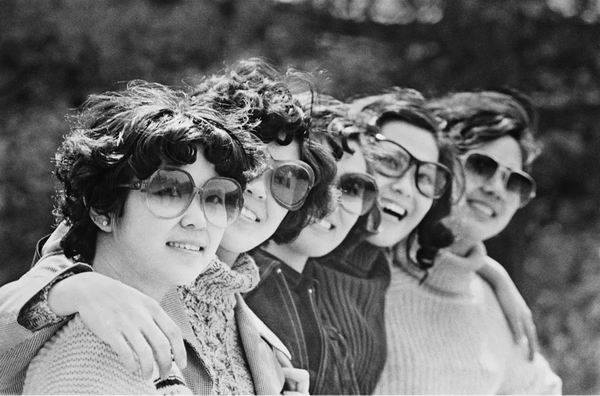 1980年,北京八大处公园里的时髦女青年。上世纪80年代,蛤蟆镜、大波浪在城市青年中风靡一时。(王文澜/摄)
