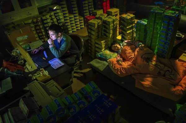 2014年11月12日凌晨1点,”双十一“购物节开始,忙碌了一整天的温州电商赵先生还在打理网上业务,妻子躺在身后的沙发上睡着了。 从2009年开始,大型电子商务网站每年都会在11月11日进行商业促销,制造出”双十一"购物节。2017年,天猫“双11”全球狂欢节的成交额达1682亿元。(赵用/摄)