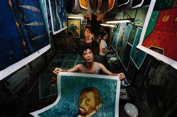 2005年,深圳大芬村,专门仿制梵高作品的赵小勇在油画作坊里。