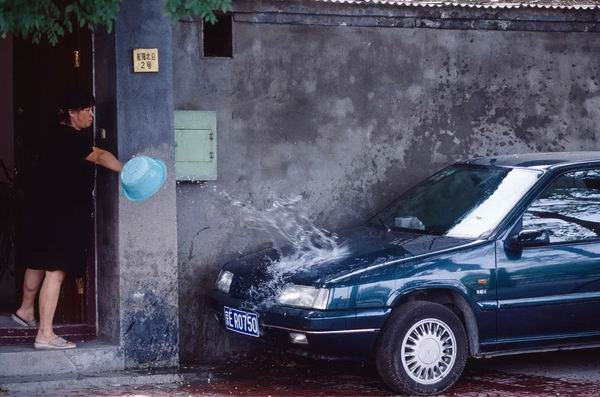 1999年,北京后海胡同里停放的私家车。