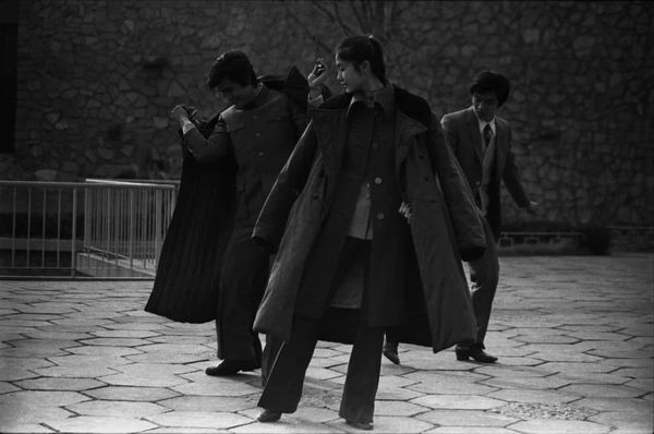 1986年,三个身披军大衣的年轻人在北京街头跳舞。上世纪80年代初,当兵是很多地区年轻人仅次于考大学的出路,一身戎装也成为很多人的向往。(郭建设/摄)