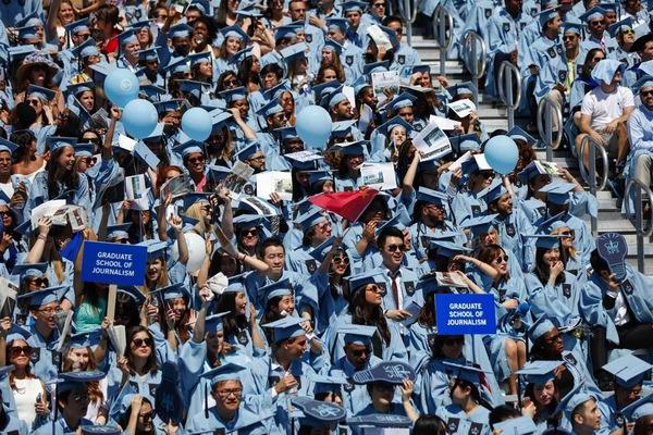 2017年5月17日,美国纽约哥伦比亚大学毕业典礼,两名中国毕业生在该校研究生院新闻专业的毕业生方阵里挥舞着中国国旗。2017年,我国出国留学人数首次突破60万大关。(廖攀/摄)