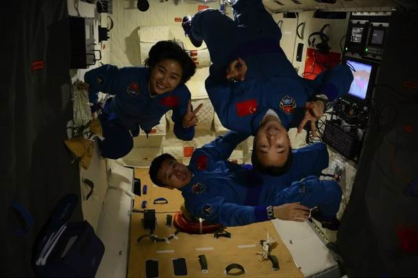 2012年6月27日,神舟九号航天员乘组在太空的自拍合影。2012年6月16日至29日,景海鹏、刘旺、刘洋三名宇航员在太空停留13天,实现航天员手控交会对接,航天员进入天宫一号工作生活,开展空间科学实验。(神舟九号航天员乘组/摄)