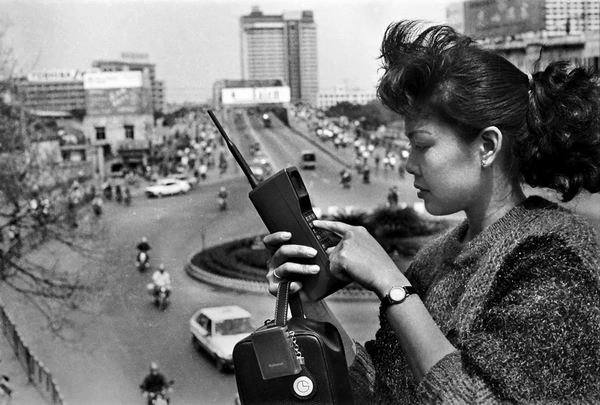 1987年,广州市江南大道,一位女士在用“大哥大”打电话。