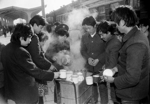 1982年早春,东北地区仍是寒风刺骨,旅客们在内蒙古通辽车站站台上排队打热水。