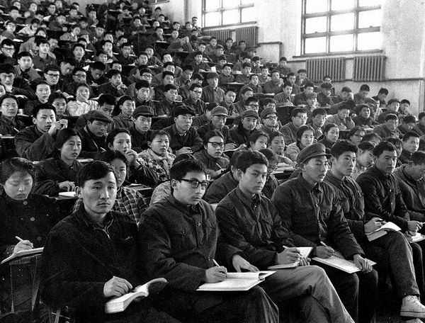 1979年,清华大学77级学生在上课。清华大学77级入学新生中,职工和下乡回乡知识青年占70%以上。1977年,中断10年的高考制度恢复。这一年,全国高考报名考生共570万人,录取率仅为5%。2017年,全国高考报名考生共940万人,录取率达74.46%。(顾德华/摄)
