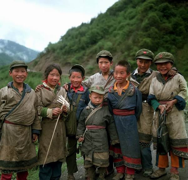 1987年4月,四川省平武县,一群白马藏族乡村少年在放学路上结伴而行。