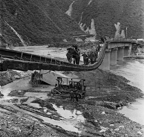 1981年8月,秦岭山区发生特大洪水和泥石流,连接内地和西南、西北的钢铁大动脉宝成铁路受损严重,西安铁路局救援人员步行向灾区送物资。60天后宝成铁路便恢复通车。(李少童/摄)
