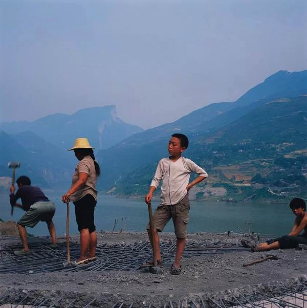 2003年5月,四川省奉节县,三峡工程第一次蓄水前,当地民工拆除江坝石信号台。