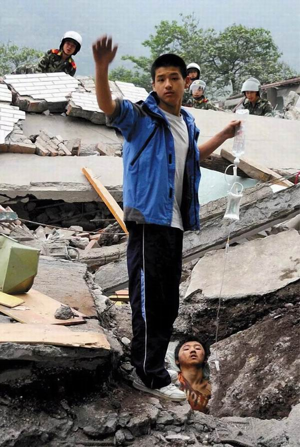 2008年5月13日清晨,汶川地震第二天,中学生李阳在北川中学废墟上手举吊瓶,为掩埋在废墟中的同学廖波输液,廖波于当日获救。后来,李阳被保送上了上海交通大学,大三时入伍。廖波装上了假肢,立业成家。(陈燮/摄)