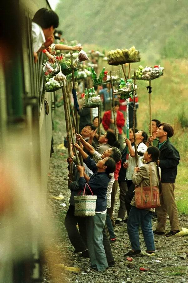 1996年10月,北京通往秦皇岛的火车在没有站台的墙子路站仅停留5分钟,当地村民举杆叫卖,向旅客推销土特产。上世纪90年代中期,全国“十亿人民九亿商”。(周朝荣/摄)