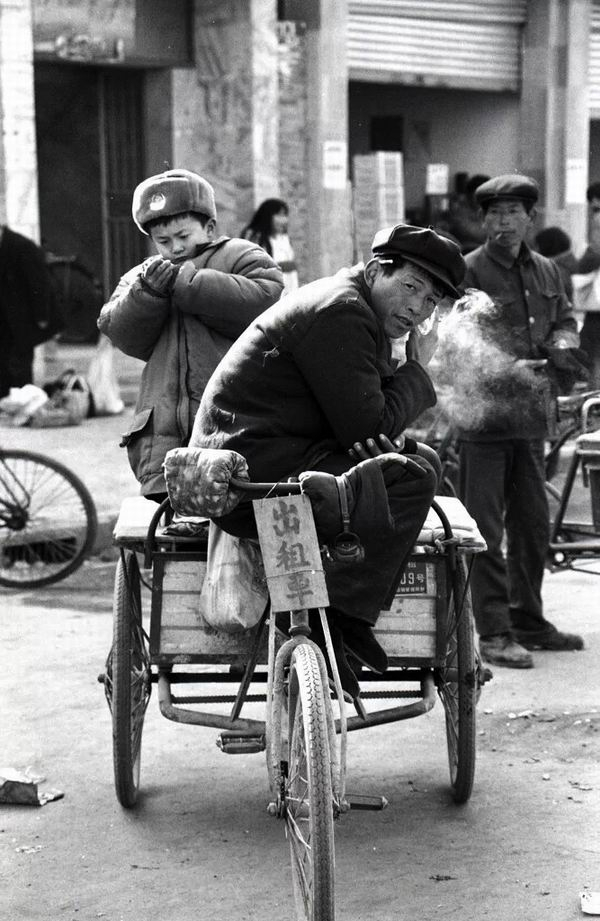 1987年,河南濮阳濮城县集市上的出租车。上世纪80年代,出租车还不多见。在机动车没有普及的小县城,三轮车就是集市上的“出租车”。(于志新/摄)