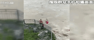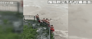 一段围观群众用手机拍摄的画面显示,7名携带了漂包等救生装备的游泳爱好者,在洪峰过境的江边做着下水前的准备活动,随后他们全部走到了堤坝围栏的外侧,依次跳进了波涛汹涌的江水中。
