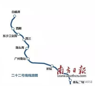 二十二号线起于番禺广场,向西向北设置祈福、广州南站、陈头岗、西朗和白鹅潭5个站点,预留西三、东沙工业园2座车站,其中换乘站4座。