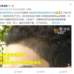 8月28日,男子小吴去杭州大学路146号的尚进美容spa店理发,对方说有个免费项目可以体验。小吴去了,结果做完对方给出清单要39000多元,折后18000元。最后小吴报警,付了2500元。