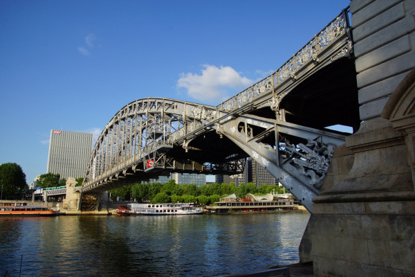 奥斯德利兹铁路桥始建于1903年,哈凯姆桥的设计者、建筑师让-卡米尔·福米吉受托设计了一座跨度达140米的全金属桥梁,打破当时巴黎所有桥梁长度的记录(直到现在,只有戴高乐桥在长度上超过前者略)。奥斯德利兹铁路桥的主体结构为一个长达140米的月牙形拱门,确切来说,是两条抛物线形状的钢弧。桥面靠着这两条抛物线空在水面上,与靠近河岸的石桥台衔接。福米吉在钢结构外侧创作了一系列以海洋为主题的浮雕装饰,包括海豚、贝壳和海草,钢底座上可以找到巴黎人纹章的雕刻图案,还有拱门上均匀分布的星形雕饰、石桥台上的牛头雕塑,都是值得玩味的建筑细节。