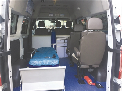 记者了解到,南京长客的非急救转运车,采用标准的救护车型制,内部配饰与正规救护车基本一致。车内按客运标准安装有3个实时监控探头。