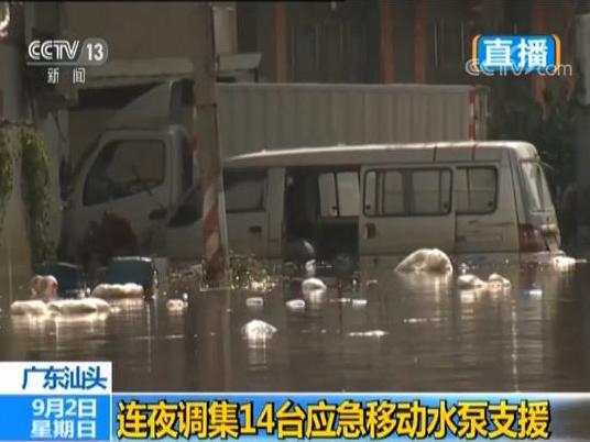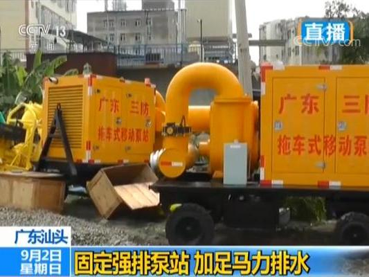 央视记者 张琦:现在原有当地固定的强排的泵站一共是5座13台的抽水泵,经过这几天的紧急的抢修,目前还有2座7台是属于故障的状态,现在正在运行的是3座6台,已经是开足马力24小时来排水,总排水的量大概能达到每小时21600立方米。除了这个以外,包括广东消防还有广东三防各个部门还是投入了应急的移动水泵,比如说广东消防投入的应急水泵就有14台,今天凌晨陆续抵达了我现在所在的这个地方,那是从广州等地抽调过来的,它到了这里以后就开始寻找合适的排水地点。
