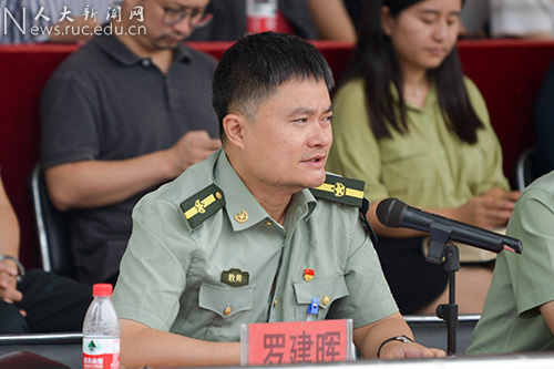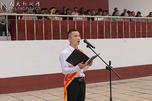 艺术学院2017级硕士研究生彭厚坚代表新入伍学生发言,感谢学校领导和老师的信任,感谢母校的培养。他庄重承诺,要铭记习总书记谆谆教诲,将爱国之心化为报国之行;同时要不忘人大人身份,苦练本领,努力成长为“有灵魂、有本事、有血性、有品德”的新一代革命军人,以实际行动为强军事业再立新功,为母校增添光彩。