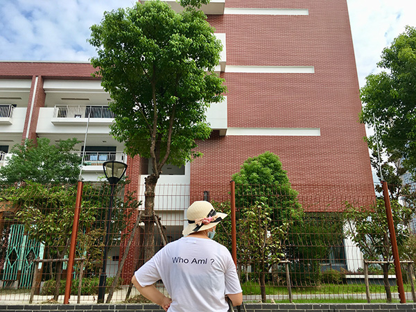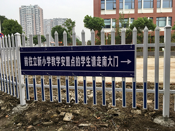 东西走向的平河路上开辟出一块空地, 崭新的白色柱之间被伸缩门拦起来,一侧的柱子上蓝色底的塑料牌上写着:“立新小学教学临时安置点”。平河路较为狭窄,学校对面是出售水产、肉类、蔬果和小吃的小店铺,人流拥挤。