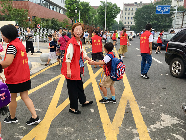 而在另一侧东西走向的江天路上,勤惜实验小学的西校门也是安保严密。江天路较为宽阔,不断有低年级的学生从电瓶车或者小轿车上下来, 校门口站了十几名穿红马甲的“志愿者”,每当一个孩子走近,她们就会主动迎上去问是哪个班级的,然后拉着孩子的手领到校门口排队。 勤惜实验小学门口停留的家长不多,但有一家英语培训机构在校门口对面发传单。