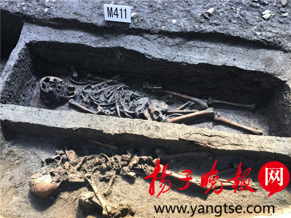 南京博物院专家介绍,目前发现的遗迹主要为墓葬、广场、灰坑、狗坑、灰沟、柱洞等。墓葬方面,已清理新石器时代墓葬7座,在其中一个区域还发现了两个头骨,应为墓葬,暂未清理。墓葬中单人墓葬4座、小孩墓葬2座(其中一座为良渚时期)、多人合葬2座、两次葬1座。其中一探方内随葬残陶器1件、骨锥2件, 其他墓葬内未发现随葬品。