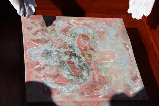 现场请出的宝匣是锡制,扁方形,其上可见青龙彩绘,标注年款显示“嘉庆六年”。故宫古建部副研究馆员徐超英坦言,有彩绘的宝匣较罕见。